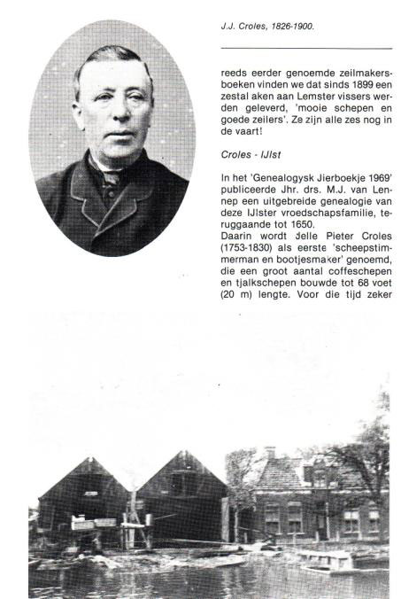 Ebenhaëzer was purchased by her current owner under the name of Geertruida, having been built by Croles of IJlst (near Sneek, Friesland) in 1904. Below is a picture of the Croles shipyard in IJlst and of J.J. Croles who was the owner of the shipyard in until his death in 1900. Co-incidentally, it turned out that the shipyard had been located no more than a 5 minutes drive from our researcher’s home (Mr Tom Vos). The yard was discontinued before WW II. In the Maritime Museum he learned that Mr J.J. Croles Jnr, who was the intended successor to the shipbuilder who had died in 1900, had no ambition for shipbuilding; he qualified as a lawyer in 1898 and later became a politician, never having had anything to do with the ship yard. The widow continued the business after 1900 with help of a foreman as this was the only way of earning a living for herself. She died in 1918 and the yard was sold on, though it ceased business somewhat later – possibly in the 1930s.