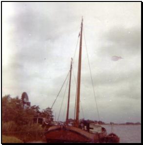 The collective documents confirm that during the war years (1938) “Ebenhaëzer” was extended by three metres. Now the vessel has been shortened again, so it is concluded that she must have been shortened to her original length later than 1964 because in the documentation of that year, the then owner Mr De Jong declared that she still measured 49,686 tons when he bought her that year. There is also a picture of her in 1962 at her longer length below (provided by J de Jong). She is the long orange and black vessel, then owned by Mr Pieter Zuidema. His parents lived in the tjalk alongside “Ebenhaëzer”. The picture was used as a local postcard. It is evident that the ship is still 19.8m LOA. Mr De Jong purchased her having viewed her in the above setting.